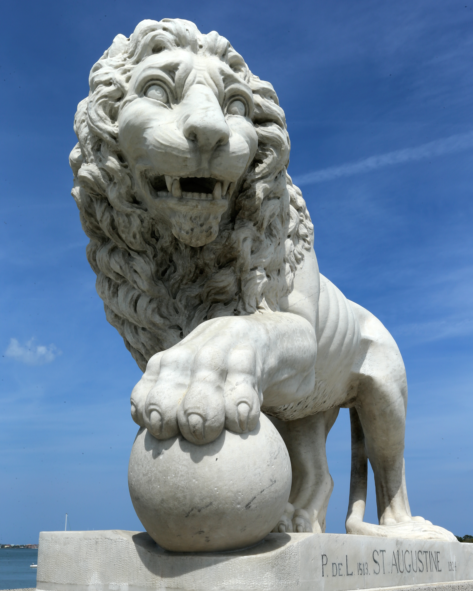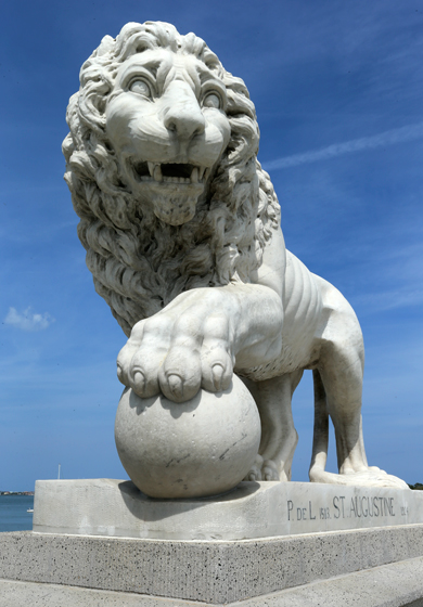 Carrara marble lion guarding the Bridge of Lions (replica of those in the Loggia dei Lanzi in Florence Italy)